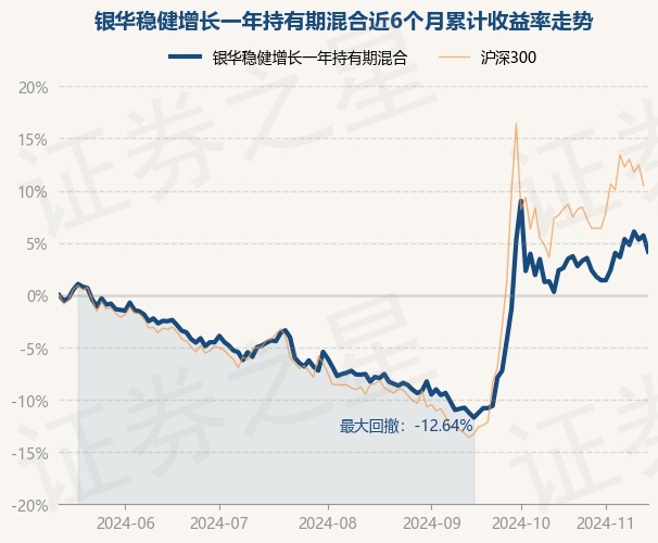证券之星消息,11月14日,银华稳健增长一年持有期混合最新单位净值为0.7026元,累计净值为0.7026元,较前一交易日下跌1.46%。历史数据显示该基金近1个月上涨0.69%,近3个月上涨13.56%,近6个月上涨4.17%,近1年上涨3.14%。该基金近6个月的累计收益率走势如下图: