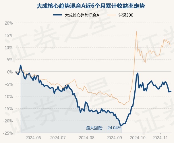 证券之星消息,11月14日,大成核心趋势混合A最新单位净值为0.9438元,累计净值为0.9438元,较前一交易日上涨0.0%。历史数据显示该基金近1个月下跌6.14%,近3个月上涨8.1%,近6个月下跌10.41%,近1年上涨5.84%。该基金近6个月的累计收益率走势如下图: