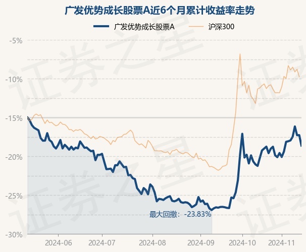 证券之星消息,11月14日,广发优势成长股票A最新单位净值为0.3955元,累计净值为0.3955元,较前一交易日下跌2.83%。历史数据显示该基金近1个月上涨2.78%,近3个月上涨18.09%,近6个月下跌7.22%,近1年下跌19.76%。该基金近6个月的累计收益率走势如下图: