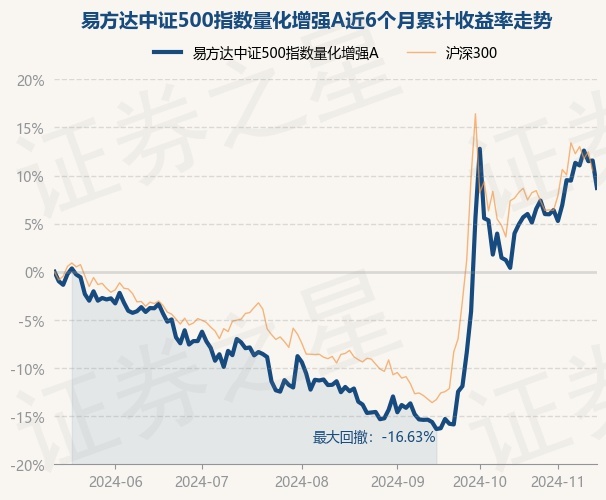证券之星消息,11月14日,易方达中证500指数量化增强A最新单位净值为0.9376元,累计净值为0.9376元,较前一交易日下跌2.56%。历史数据显示该基金近1个月上涨4.56%,近3个月上涨24.25%,近6个月上涨8.71%,近1年上涨11.54%。该基金近6个月的累计收益率走势如下图: