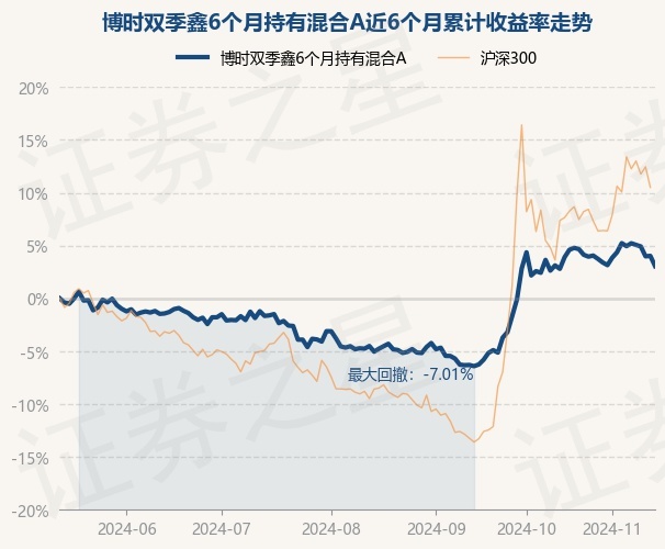 证券之星消息,11月14日,博时双季鑫6个月持有混合A最新单位净值为1.0274元,累计净值为1.0274元,较前一交易日下跌0.93%。历史数据显示该基金近1个月下跌0.56%,近3个月上涨8.52%,近6个月上涨3.06%,近1年上涨6.1%。该基金近6个月的累计收益率走势如下图: