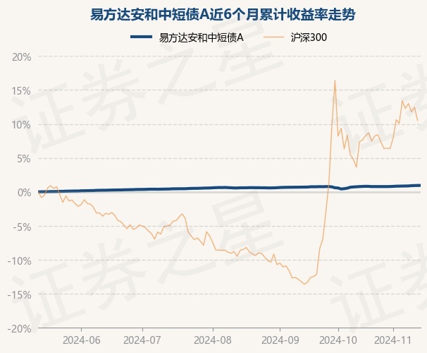 证券之星消息,11月14日,易方达安和中短债A最新单位净值为1.0695元,累计净值为1.1195元,较前一交易日上涨0.01%。历史数据显示该基金近1个月上涨0.27%,近3个月上涨0.35%,近6个月上涨0.95%,近1年上涨2.86%。该基金近6个月的累计收益率走势如下图: