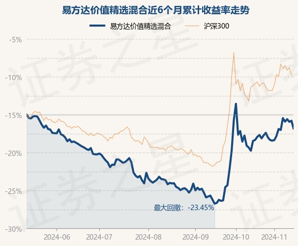 证券之星消息,11月14日,易方达价值精选混合最新单位净值为1.1665元,累计净值为3.8755元,较前一交易日下跌2.06%。历史数据显示该基金近1个月上涨2.0%,近3个月上涨18.08%,近6个月下跌3.6%,近1年上涨4.57%。该基金近6个月的累计收益率走势如下图: