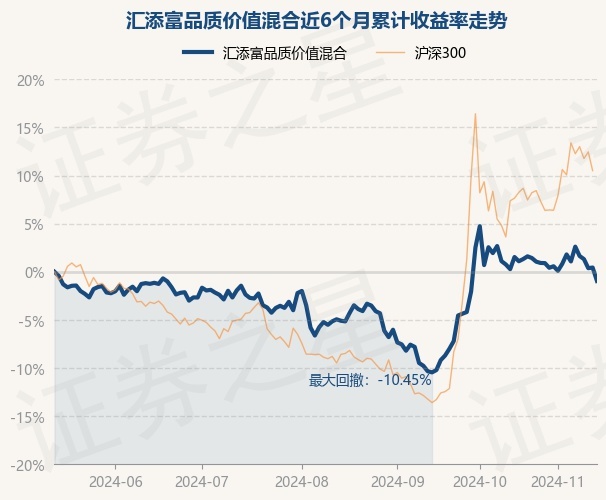 证券之星消息,11月14日,汇添富品质价值混合最新单位净值为1.1233元,累计净值为1.1233元,较前一交易日下跌1.39%。历史数据显示该基金近1个月下跌3.53%,近3个月上涨4.36%,近6个月下跌0.95%,近1年上涨10.33%。该基金近6个月的累计收益率走势如下图: