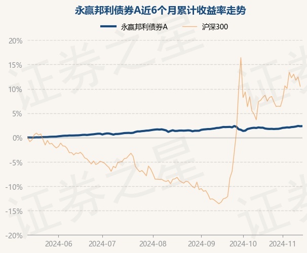 证券之星消息,11月14日,永赢邦利债券A最新单位净值为1.1214元,累计净值为1.1814元,较前一交易日上涨0.02%。历史数据显示该基金近1个月上涨0.38%,近3个月上涨0.84%,近6个月上涨2.34%,近1年上涨5.27%。该基金近6个月的累计收益率走势如下图: