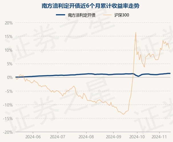 证券之星消息,11月14日,南方涪利定开债最新单位净值为1.2971元,累计净值为1.3321元,较前一交易日上涨0.01%。历史数据显示该基金近1个月上涨0.4%,近3个月上涨0.29%,近6个月上涨1.38%,近1年上涨4.14%。该基金近6个月的累计收益率走势如下图: