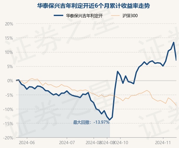 证券之星消息,11月15日,华泰保兴吉年利定开最新单位净值为0.8906元,累计净值为2.1728元,较前一交易日下跌5.49%。历史数据显示该基金近1个月上涨7.6%,近3个月上涨19.05%,近6个月上涨7.16%,近1年上涨1.88%。该基金近6个月的累计收益率走势如下图: