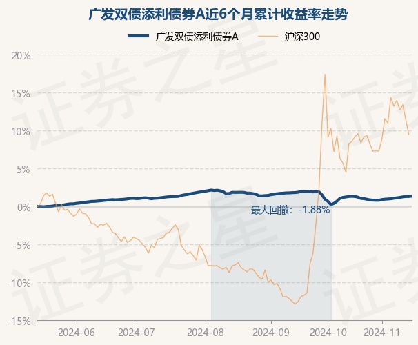 证券之星消息,11月15日,广发双债添利债券A最新单位净值为1.2175元,累计净值为1.6404元,较前一交易日上涨0.04%。历史数据显示该基金近1个月上涨0.16%,近3个月下跌0.49%,近6个月上涨1.36%,近1年上涨5.18%。该基金近6个月的累计收益率走势如下图: