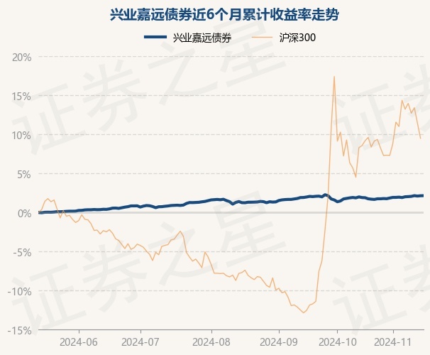 证券之星消息,11月15日,兴业嘉远债券最新单位净值为1.0251元,累计净值为1.0511元,较前一交易日上涨0.01%。历史数据显示该基金近1个月上涨0.22%,近3个月上涨0.88%,近6个月上涨2.15%,近1年上涨4.83%。该基金近6个月的累计收益率走势如下图: