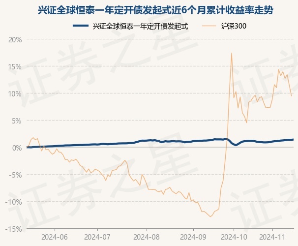 证券之星消息,11月15日,兴证全球恒泰一年定开债发起式最新单位净值为1.0129元,累计净值为1.0798元,较前一交易日上涨0.04%。历史数据显示该基金近1个月上涨0.3%,近3个月上涨0.36%,近6个月上涨1.42%,近1年上涨4.23%。该基金近6个月的累计收益率走势如下图: