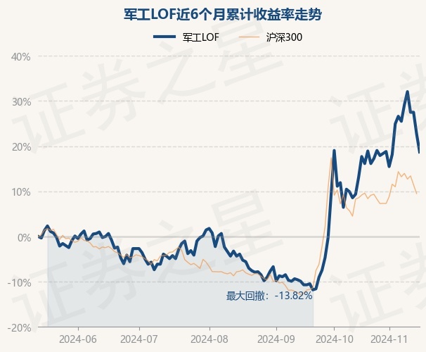 证券之星消息,11月15日,军工LOF最新单位净值为1.066元,累计净值为1.74元,较前一交易日下跌3.27%。历史数据显示该基金近1个月上涨8.0%,近3个月上涨23.52%,近6个月上涨18.71%,近1年上涨6.81%。该基金近6个月的累计收益率走势如下图: