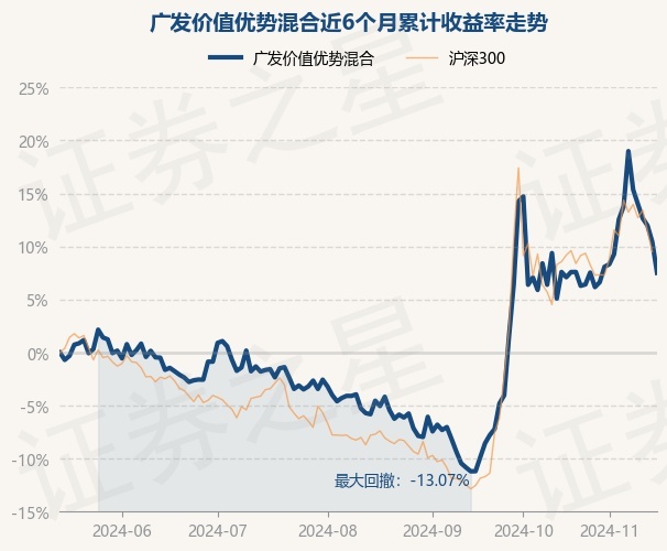 证券之星消息,11月15日,广发价值优势混合最新单位净值为1.5158元,累计净值为1.5158元,较前一交易日下跌2.64%。历史数据显示该基金近1个月上涨1.05%,近3个月上涨12.63%,近6个月上涨7.51%,近1年上涨21.09%。该基金近6个月的累计收益率走势如下图: