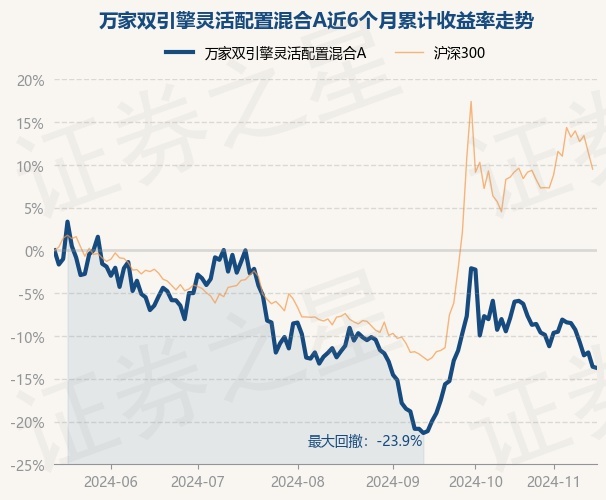 证券之星消息,11月15日,万家双引擎灵活配置混合A最新单位净值为2.0281元,累计净值为3.1681元,较前一交易日下跌0.18%。历史数据显示该基金近1个月下跌4.92%,近3个月下跌2.22%,近6个月下跌13.75%,近1年上涨11.28%。该基金近6个月的累计收益率走势如下图: