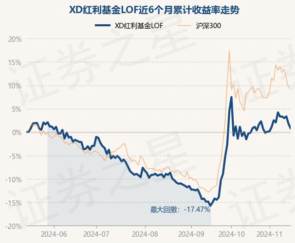 证券之星消息,11月15日,XD红利基金LOF最新单位净值为1.6163元,累计净值为1.6667元,较前一交易日下跌0.96%。历史数据显示该基金近1个月上涨1.68%,近3个月上涨10.72%,近6个月上涨0.83%,近1年上涨14.42%。该基金近6个月的累计收益率走势如下图: