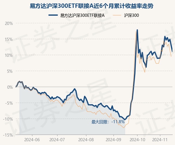 证券之星消息,11月15日,易方达沪深300ETF联接A最新单位净值为1.5633元,累计净值为1.5633元,较前一交易日下跌1.66%。历史数据显示该基金近1个月上涨2.94%,近3个月上涨17.73%,近6个月上涨11.12%,近1年上涨11.99%。该基金近6个月的累计收益率走势如下图: