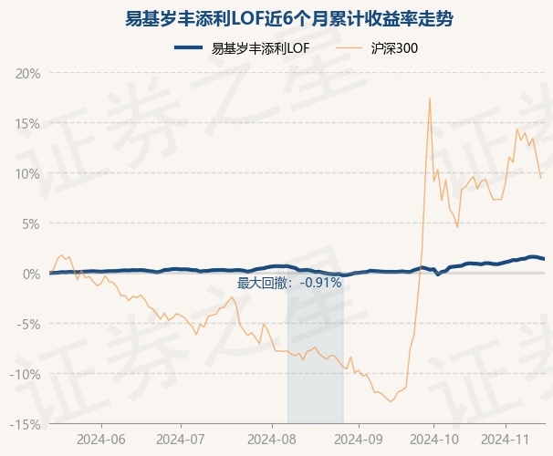 证券之星消息,11月15日,易基岁丰添利LOF最新单位净值为1.6671元,累计净值为2.5781元,较前一交易日下跌0.07%。历史数据显示该基金近1个月上涨0.77%,近3个月上涨1.16%,近6个月上涨1.4%,近1年上涨4.81%。该基金近6个月的累计收益率走势如下图: