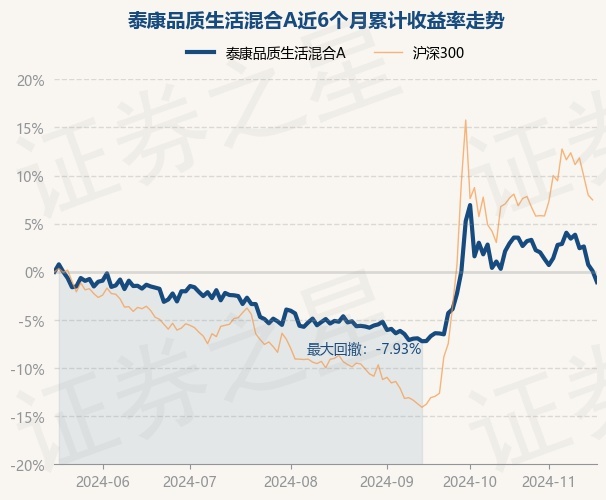 证券之星消息,11月18日,泰康品质生活混合A最新单位净值为1.1022元,累计净值为1.1022元,较前一交易日下跌1.15%。历史数据显示该基金近1个月下跌3.14%,近3个月上涨4.35%,近6个月下跌1.07%,近1年上涨7.27%。该基金近6个月的累计收益率走势如下图: