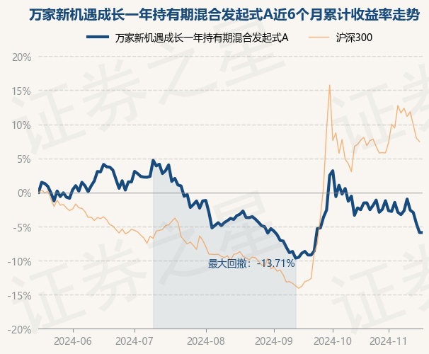 证券之星消息,11月18日,万家新机遇成长一年持有期混合发起式A最新单位净值为0.8485元,累计净值为0.8485元,较前一交易日上涨0.0%。历史数据显示该基金近1个月下跌3.81%,近3个月下跌2.88%,近6个月下跌5.99%,近1年上涨2.77%。该基金近6个月的累计收益率走势如下图: