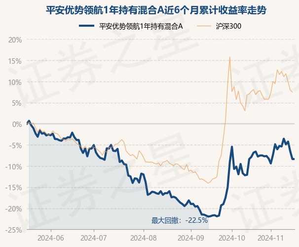 证券之星消息,11月18日,平安优势领航1年持有混合A最新单位净值为0.5832元,累计净值为0.5832元,较前一交易日上涨0.0%。历史数据显示该基金近1个月下跌1.72%,近3个月上涨7.78%,近6个月下跌9.94%,近1年下跌17.65%。该基金近6个月的累计收益率走势如下图: