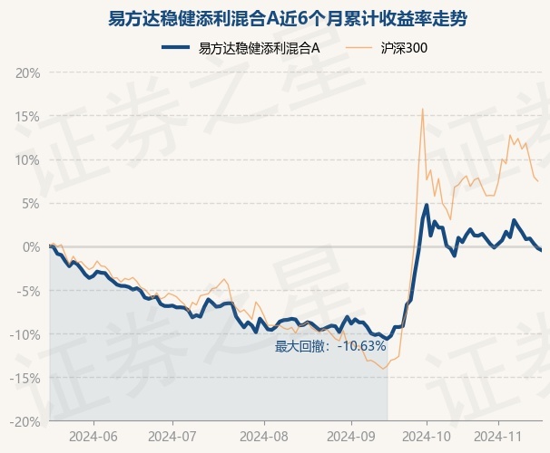 证券之星消息,11月18日,易方达稳健添利混合A最新单位净值为0.9632元,累计净值为0.9632元,较前一交易日下跌0.24%。历史数据显示该基金近1个月下跌1.42%,近3个月上涨9.03%,近6个月下跌0.47%,近1年上涨5.48%。该基金近6个月的累计收益率走势如下图: