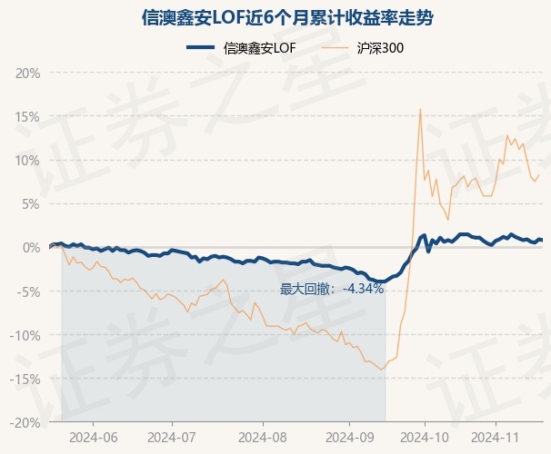 证券之星消息,11月18日,信澳鑫安LOF最新单位净值为1.065元,累计净值为1.392元,较前一交易日上涨0.38%。历史数据显示该基金近1个月下跌0.09%,近3个月上涨2.6%,近6个月上涨0.85%,近1年上涨5.86%。该基金近6个月的累计收益率走势如下图: