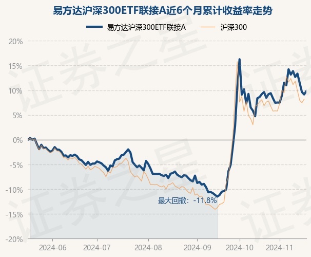 证券之星消息,11月18日,易方达沪深300ETF联接A最新单位净值为1.5563元,累计净值为1.5563元,较前一交易日下跌0.45%。历史数据显示该基金近1个月上涨0.71%,近3个月上涨17.03%,近6个月上涨9.15%,近1年上涨12.64%。该基金近6个月的累计收益率走势如下图: