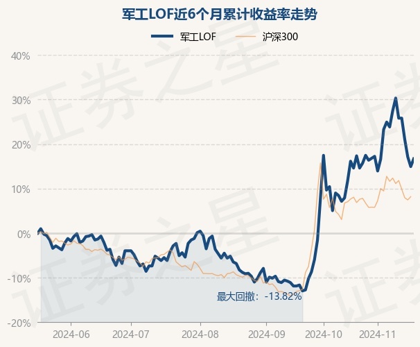 证券之星消息,11月19日,军工LOF最新单位净值为1.062元,累计净值为1.738元,较前一交易日上涨1.53%。历史数据显示该基金近1个月上涨4.53%,近3个月上涨25.24%,近6个月上涨16.7%,近1年上涨7.38%。该基金近6个月的累计收益率走势如下图: