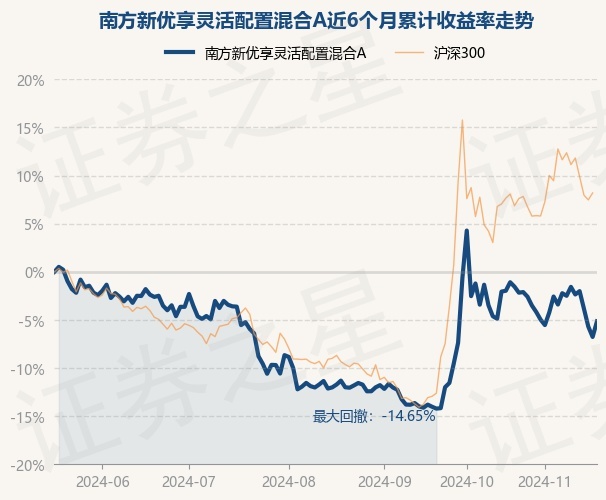 证券之星消息,11月19日,南方新优享灵活配置混合A最新单位净值为3.12元,累计净值为3.12元,较前一交易日上涨1.74%。历史数据显示该基金近1个月下跌3.16%,近3个月上涨6.94%,近6个月下跌5.15%,近1年上涨7.4%。该基金近6个月的累计收益率走势如下图: