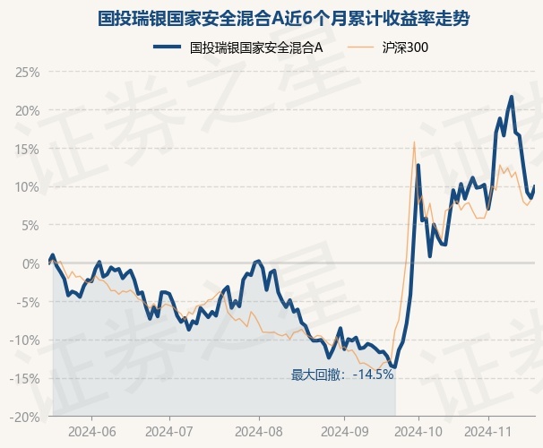 证券之星消息,11月19日,国投瑞银国家安全混合A最新单位净值为1.0803元,累计净值为1.2393元,较前一交易日上涨1.36%。历史数据显示该基金近1个月上涨3.78%,近3个月上涨19.77%,近6个月上涨9.9%,近1年上涨8.25%。该基金近6个月的累计收益率走势如下图: