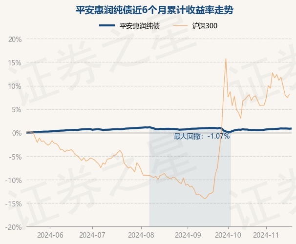 证券之星消息,11月19日,平安惠润纯债最新单位净值为1.0652元,累计净值为1.1372元,较前一交易日上涨0.04%。历史数据显示该基金近1个月上涨0.21%,近3个月上涨0.06%,近6个月上涨0.87%,近1年上涨2.74%。该基金近6个月的累计收益率走势如下图: