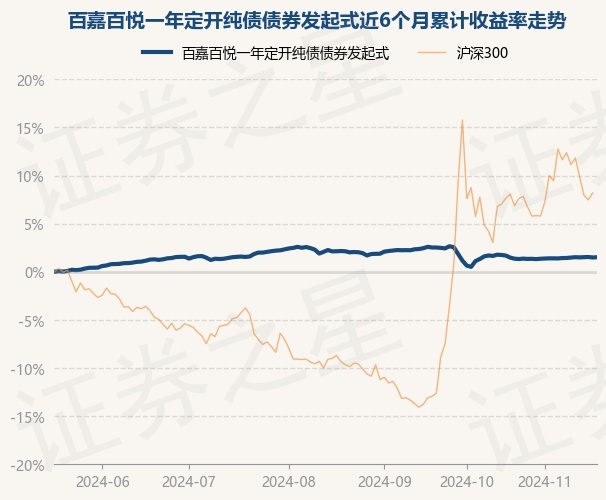 证券之星消息,11月19日,百嘉百悦一年定开纯债债券发起式最新单位净值为1.019元,累计净值为1.0496元,较前一交易日上涨0.02%。历史数据显示该基金近1个月下跌0.23%,近3个月下跌0.64%,近6个月上涨1.51%,近1年上涨4.45%。该基金近6个月的累计收益率走势如下图: