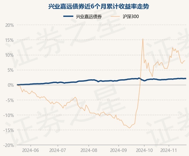 证券之星消息,11月20日,兴业嘉远债券最新单位净值为1.025元,累计净值为1.051元,较前一交易日上涨0.0%。历史数据显示该基金近1个月上涨1.01%,近3个月上涨1.6%,近6个月上涨2.9%,近1年上涨5.64%。该基金近6个月的累计收益率走势如下图: