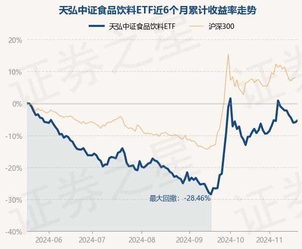 证券之星消息,11月20日,天弘中证食品饮料ETF最新单位净值为0.7422元,累计净值为0.7422元,较前一交易日上涨0.58%。历史数据显示该基金近1个月上涨5.68%,近3个月上涨20.43%,近6个月下跌5.36%,近1年下跌8.53%。该基金近6个月的累计收益率走势如下图: