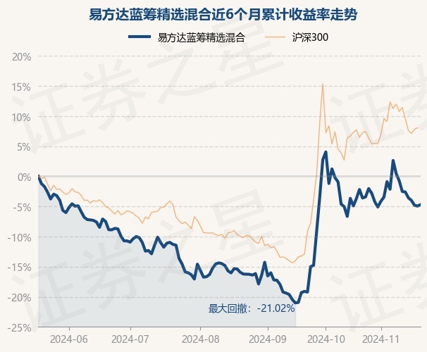 证券之星消息,11月20日,易方达蓝筹精选混合最新单位净值为1.792元,累计净值为1.792元,较前一交易日上涨0.27%。历史数据显示该基金近1个月下跌1.07%,近3个月上涨13.37%,近6个月下跌4.7%,近1年下跌6.69%。该基金近6个月的累计收益率走势如下图:
