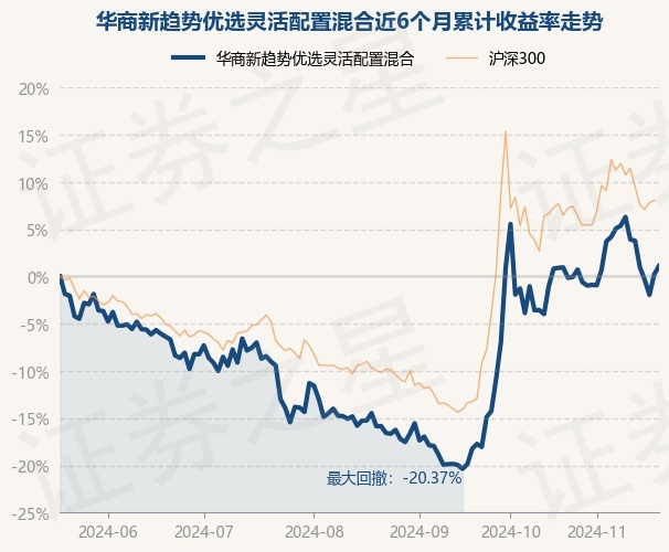 证券之星消息,11月20日,华商新趋势优选灵活配置混合最新单位净值为10.052元,累计净值为10.052元,较前一交易日上涨0.89%。历史数据显示该基金近1个月上涨2.13%,近3个月上涨20.18%,近6个月上涨1.12%,近1年上涨9.12%。该基金近6个月的累计收益率走势如下图: