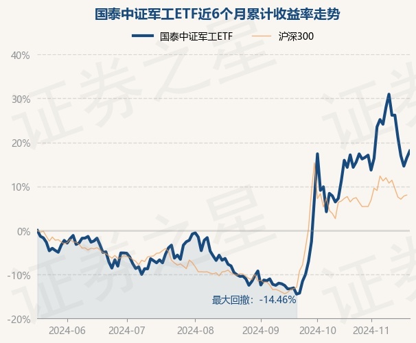 证券之星消息,11月20日,国泰中证军工ETF最新单位净值为1.0943元,累计净值为1.0943元,较前一交易日上涨1.34%。历史数据显示该基金近1个月上涨6.17%,近3个月上涨30.55%,近6个月上涨18.07%,近1年上涨7.31%。该基金近6个月的累计收益率走势如下图: