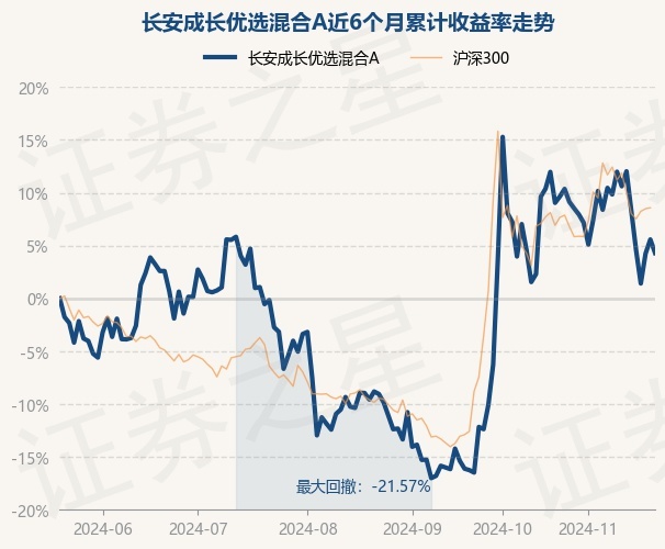 证券之星消息,11月21日,长安成长优选混合A最新单位净值为0.5386元,累计净值为0.5386元,较前一交易日下跌1.21%。历史数据显示该基金近1个月下跌5.51%,近3个月上涨14.38%,近6个月上涨4.3%,近1年上涨5.11%。该基金近6个月的累计收益率走势如下图: