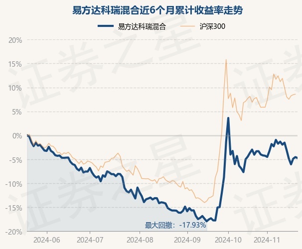 证券之星消息,11月21日,易方达科瑞混合最新单位净值为1.7453元,累计净值为5.2523元,较前一交易日下跌0.2%。历史数据显示该基金近1个月下跌0.31%,近3个月上涨12.7%,近6个月下跌4.73%,近1年下跌4.11%。该基金近6个月的累计收益率走势如下图:
