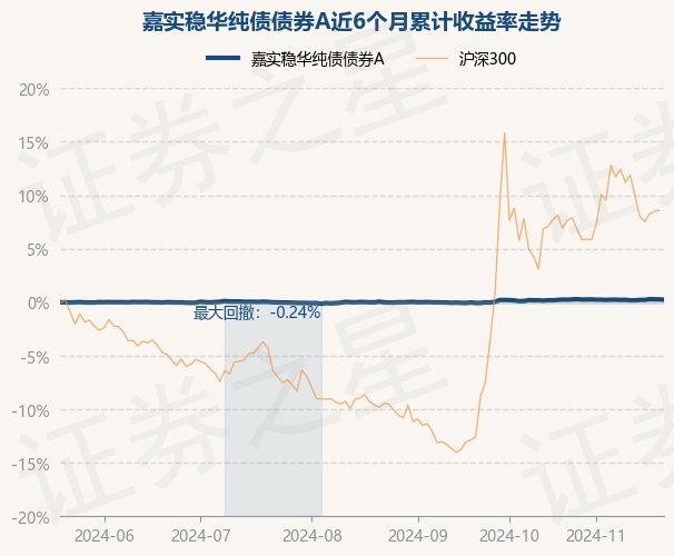 证券之星消息,11月21日,嘉实稳华纯债债券A最新单位净值为1.0325元,累计净值为1.2782元,较前一交易日下跌0.03%。历史数据显示该基金近1个月上涨0.06%,近3个月上涨0.18%,近6个月上涨0.23%,近1年上涨1.16%。该基金近6个月的累计收益率走势如下图: