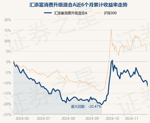 证券之星消息,11月22日,汇添富消费升级混合A最新单位净值为1.5462元,累计净值为1.5462元,较前一交易日下跌2.3%。历史数据显示该基金近1个月下跌6.64%,近3个月上涨8.48%,近6个月下跌11.52%,近1年下跌9.66%。该基金近6个月的累计收益率走势如下图: