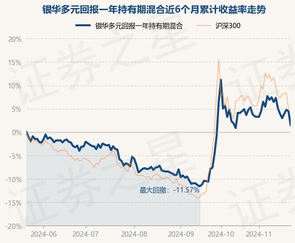 证券之星消息,11月22日,银华多元回报一年持有期混合最新单位净值为0.6851元,累计净值为0.6851元,较前一交易日下跌2.81%。历史数据显示该基金近1个月下跌2.82%,近3个月上涨10.86%,近6个月上涨1.51%,近1年上涨0.44%。该基金近6个月的累计收益率走势如下图: