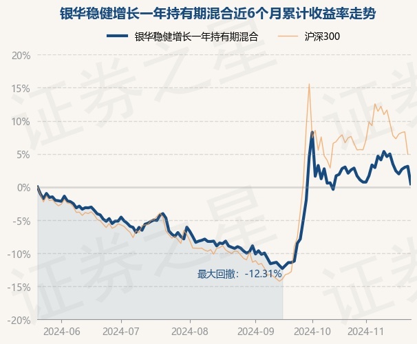 证券之星消息,11月22日,银华稳健增长一年持有期混合最新单位净值为0.6823元,累计净值为0.6823元,较前一交易日下跌2.57%。历史数据显示该基金近1个月下跌2.25%,近3个月上涨10.75%,近6个月上涨0.47%,近1年上涨0.92%。该基金近6个月的累计收益率走势如下图:
