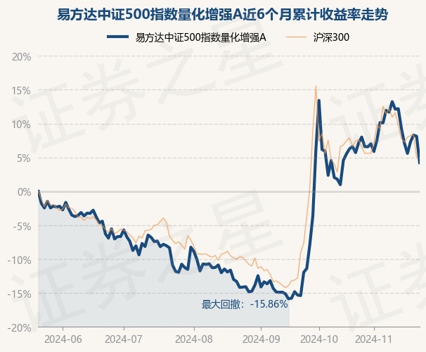 证券之星消息,11月22日,易方达中证500指数量化增强A最新单位净值为0.8938元,累计净值为0.8938元,较前一交易日下跌3.61%。历史数据显示该基金近1个月下跌1.93%,近3个月上涨21.44%,近6个月上涨4.22%,近1年上涨7.67%。该基金近6个月的累计收益率走势如下图: