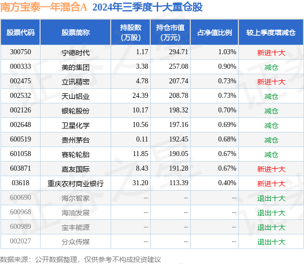 南方宝泰一年混合A为混合型-偏债基金,根据最新一期基金季报显示,该基金资产配置:股票占净值比26.47%,债券占净值比79.78%,现金占净值比2.27%。基金十大重仓股如下: