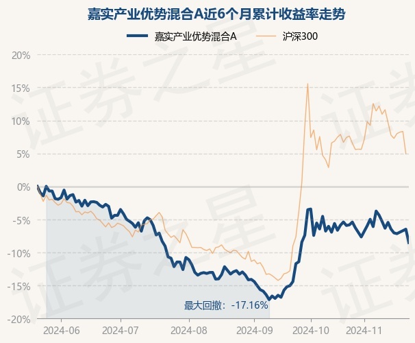 证券之星消息,11月22日,嘉实产业优势混合A最新单位净值为0.8806元,累计净值为0.8806元,较前一交易日下跌2.17%。历史数据显示该基金近1个月下跌2.79%,近3个月上涨5.08%,近6个月下跌8.5%,近1年上涨8.6%。该基金近6个月的累计收益率走势如下图: