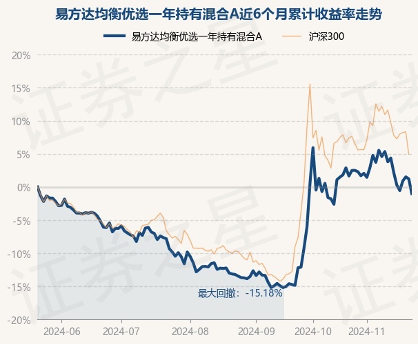 证券之星消息,11月22日,易方达均衡优选一年持有混合A最新单位净值为1.0416元,累计净值为1.0416元,较前一交易日下跌2.2%。历史数据显示该基金近1个月下跌2.77%,近3个月上涨14.07%,近6个月下跌1.0%,近1年上涨1.78%。该基金近6个月的累计收益率走势如下图: