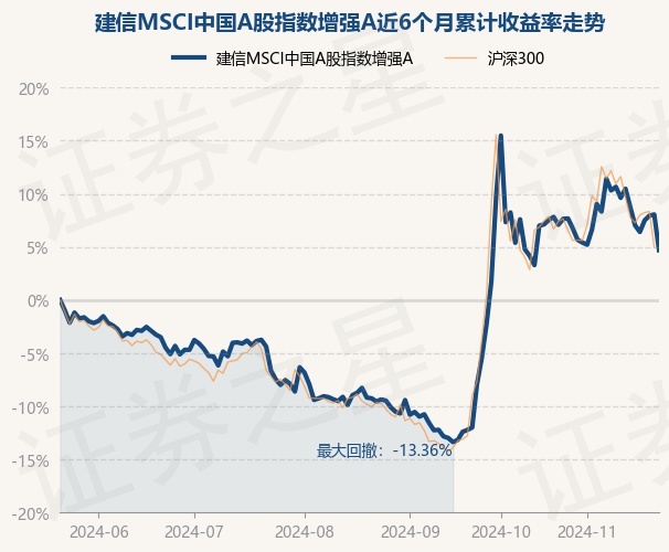证券之星消息,11月22日,建信MSCI中国A股指数增强A最新单位净值为1.147元,累计净值为1.408元,较前一交易日下跌3.1%。历史数据显示该基金近1个月下跌2.63%,近3个月上涨15.75%,近6个月上涨4.7%,近1年上涨7.67%。该基金近6个月的累计收益率走势如下图: