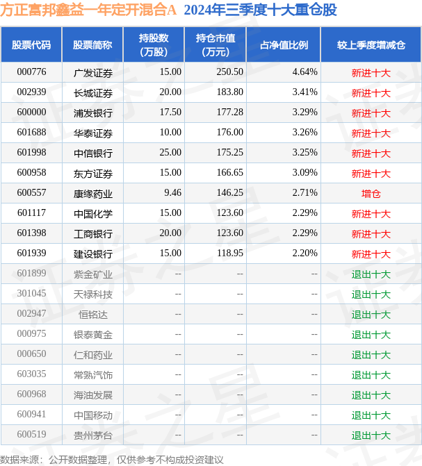 方正富邦鑫益一年定开混合A为混合型-灵活基金,根据最新一期基金季报显示,该基金资产配置:股票占净值比80.19%,无债券类资产,现金占净值比23.8%。基金十大重仓股如下: