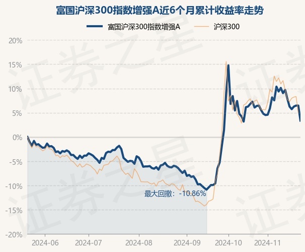 证券之星消息,11月22日,富国沪深300指数增强A最新单位净值为1.533元,累计净值为2.119元,较前一交易日下跌2.91%。历史数据显示该基金近1个月下跌3.22%,近3个月上涨10.29%,近6个月上涨3.37%,近1年上涨8.11%。该基金近6个月的累计收益率走势如下图: