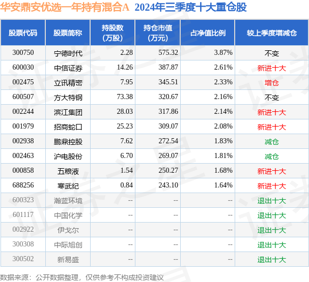 华安鼎安优选一年持有混合A为混合型-偏债基金,根据最新一期基金季报显示,该基金资产配置:股票占净值比51.91%,债券占净值比27.54%,现金占净值比16.32%。基金十大重仓股如下: